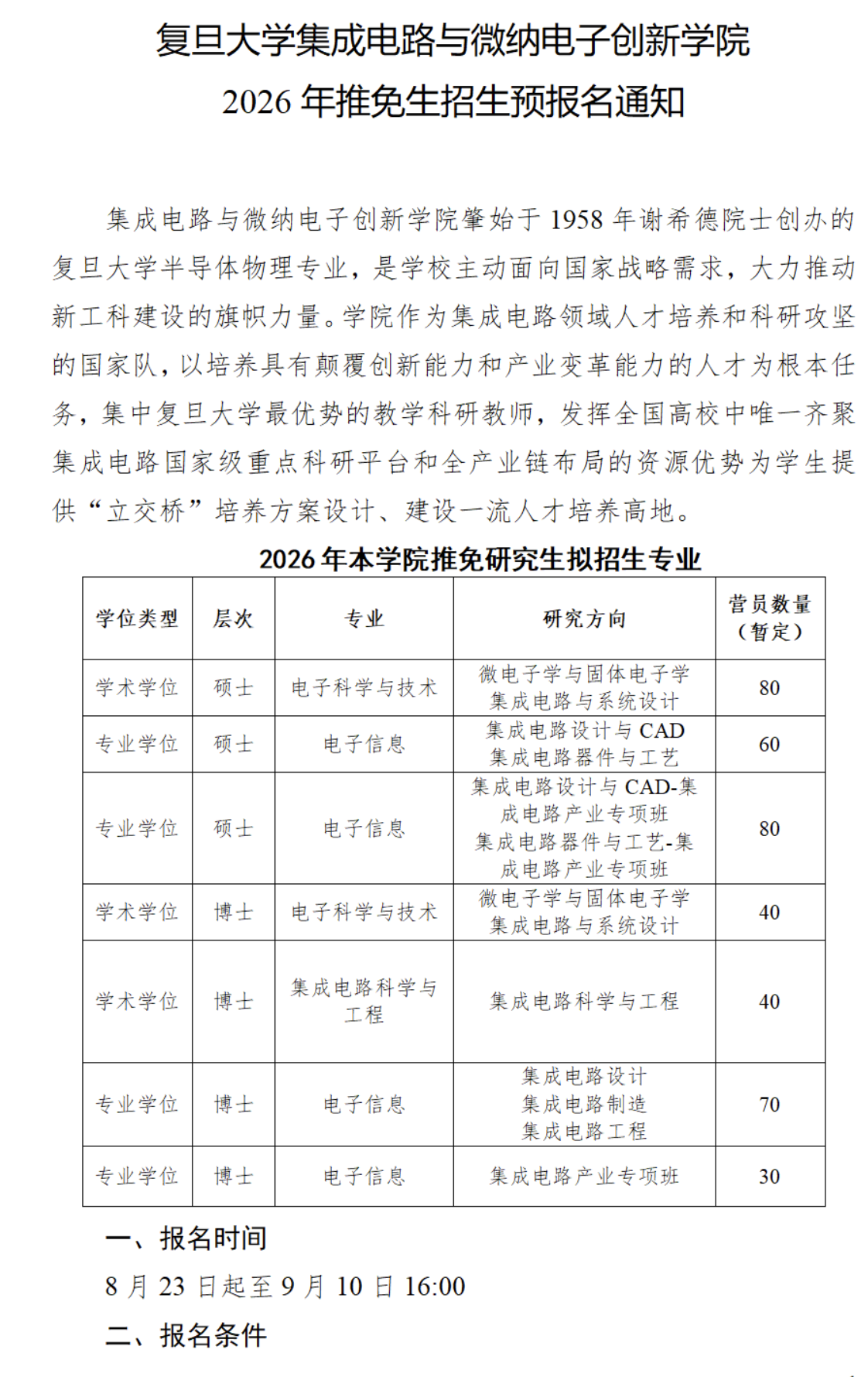 2026年复旦大学集成电路与微纳电子创新学院推免生招生预报名通知